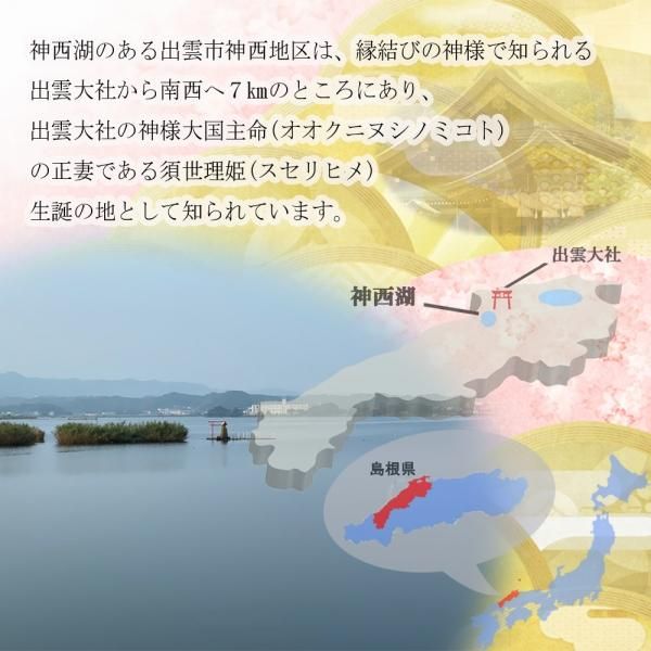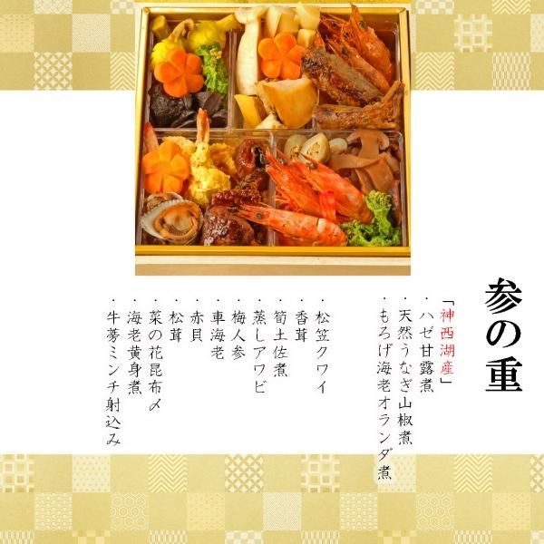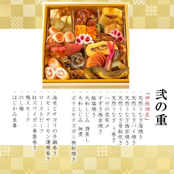 神西湖産天然うなぎをはじめ、大和しじみや、もろげ海老、コノシロ、ハゼ、すずきなど、神西湖の食材をふんだんに使用したおせちです。